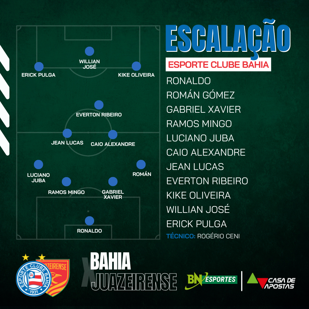 Bahia: Ronaldo; Roman Gomez, Gabriel Xavier, Ramos Mingo e Luciano Juba; Caio Alexandre, Jean Lucas e Everton Ribeiro; Kike Oliveira, Erick Pulga e Willian José. Técnico: Rogério Ceni.